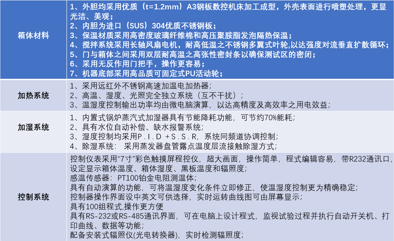 | 控制系统 | 1、控制仪表采用 “7寸”彩色触摸屏程控仪,超大画面,操作简单,程式编辑容易 2、具有断电记忆功能,复电时可继续剩余之试验过程 3、温度控制均采用P . I . D +S . S . R,系统同频道协调控制, 可提高控制元件与界面使用之稳定性及寿命; 4、具有RS-232或RS-485通讯界面,可在电脑上设计程式; 监视试验过程并执行自动开关机、打印曲线、数据等功能; 5、具有P . I . D 自动演算之功能,可减少人为设定时带来之不便; 6、光照和湿度、喷淋可独立控制也可以交替循环控制; 7、显示界面:直接显示箱体温度、箱体湿度、黑板温度和辐照度 | ![]() | |||||